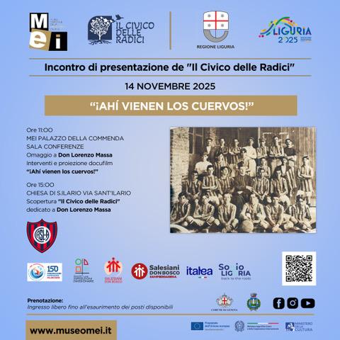 Venerdì 14 novembre, alle ore 11, al MEI si celebra Don Lorenzo Massa con un omaggio nell’ambito del progetto “Il Civico delle Radici”. In questa occasione al MEI, si terrà un convegno dedicato al sacerdote, in vista del 150° anniversario delle missioni salesiane nel mondo, con la proiezione del mini-documentario “¡Ahí vienen los cuervos!”. A seguire, alle ore 15, sarà inaugurata la targa “parlante” che verrà affissa sulla chiesa di Sant’Ilario, luogo in cui il padre fu battezzato. Il progetto è finanziato da Regione Liguria, in occasione dell’anno della Liguria Regione Europea dello Sport, e realizzato in collaborazione con il Club Atlético San Lorenzo de Almagro e Italea Liguria, che ha svolto le ricerche genealogiche sui genitori di Don Lorenzo Massa.