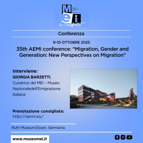 Dal 9 al 10 ottobre il Museo MEI partecipa alla 35a° Conferenza AEMI, Association of European Migration Institutions, una rete di quaranta organizzazioni europee che concentra la sua attività sullo studio della storia delle migrazioni in Europa. L'Associazione è stata fondata in Germania nel 1991 e ad oggi include i rappresentanti di ben venti paesi europei.