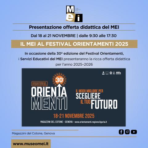 Il MEI partecipa alla 30ª edizione del Festival Orientamenti, il grande appuntamento nazionale che ogni anno coinvolge giovani, docenti, educatori e famiglie sui temi di orientamento, formazione e lavoro.