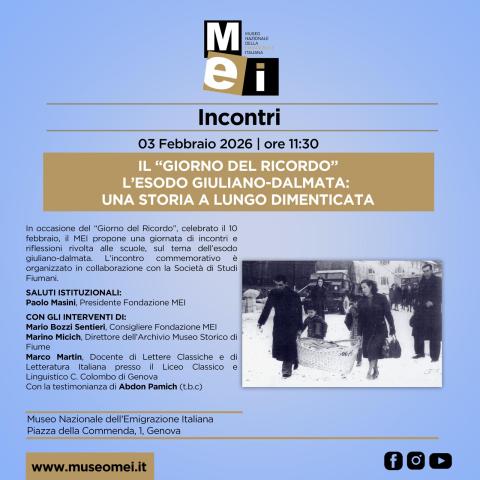 In occasione del “Giorno del Ricordo”, il MEI propone una giornata di incontri e riflessioni rivolta alle scuole, sul tema dell’esodo giuliano-dalmata. L’incontro commemorativo, organizzato in collaborazione con la Società di Studi Fiumani, si terrà il 3 febbraio alle ore 11:30.