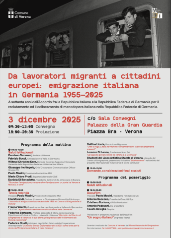 Mercoledì 3 dicembre 2025 a Verona si celebrano i 70 anni dell’accordo italo-tedesco sul lavoro, firmato il 20 dicembre 1955. L’iniziativa è promossa dal Comune di Verona in collaborazione con Mei – Museo Nazionale dell’Emigrazione Italiana.