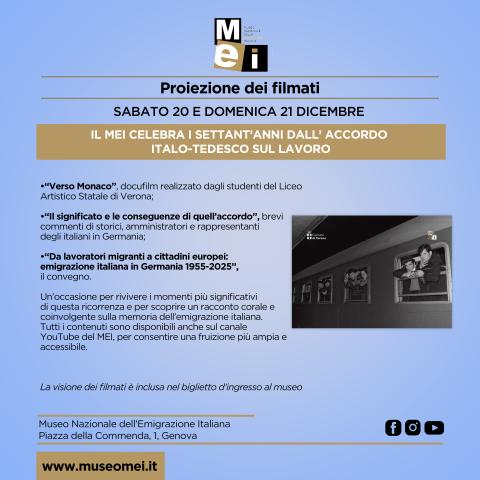 Sabato 20 e domenica 21 dicembre, in occasione dell’anniversario della firma dell’accordo italo-tedesco sul lavoro, saranno proiettati al MEI i video realizzati per celebrare questo importante avvenimento.